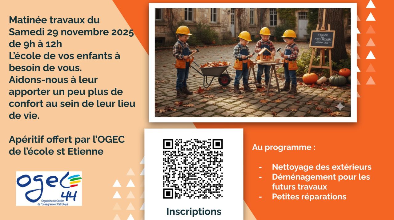 Nous vous convions à la matinée travaux de l’école Saint-Etienne qui aura lieu le samedi 29 novembre de 9h à 12h !